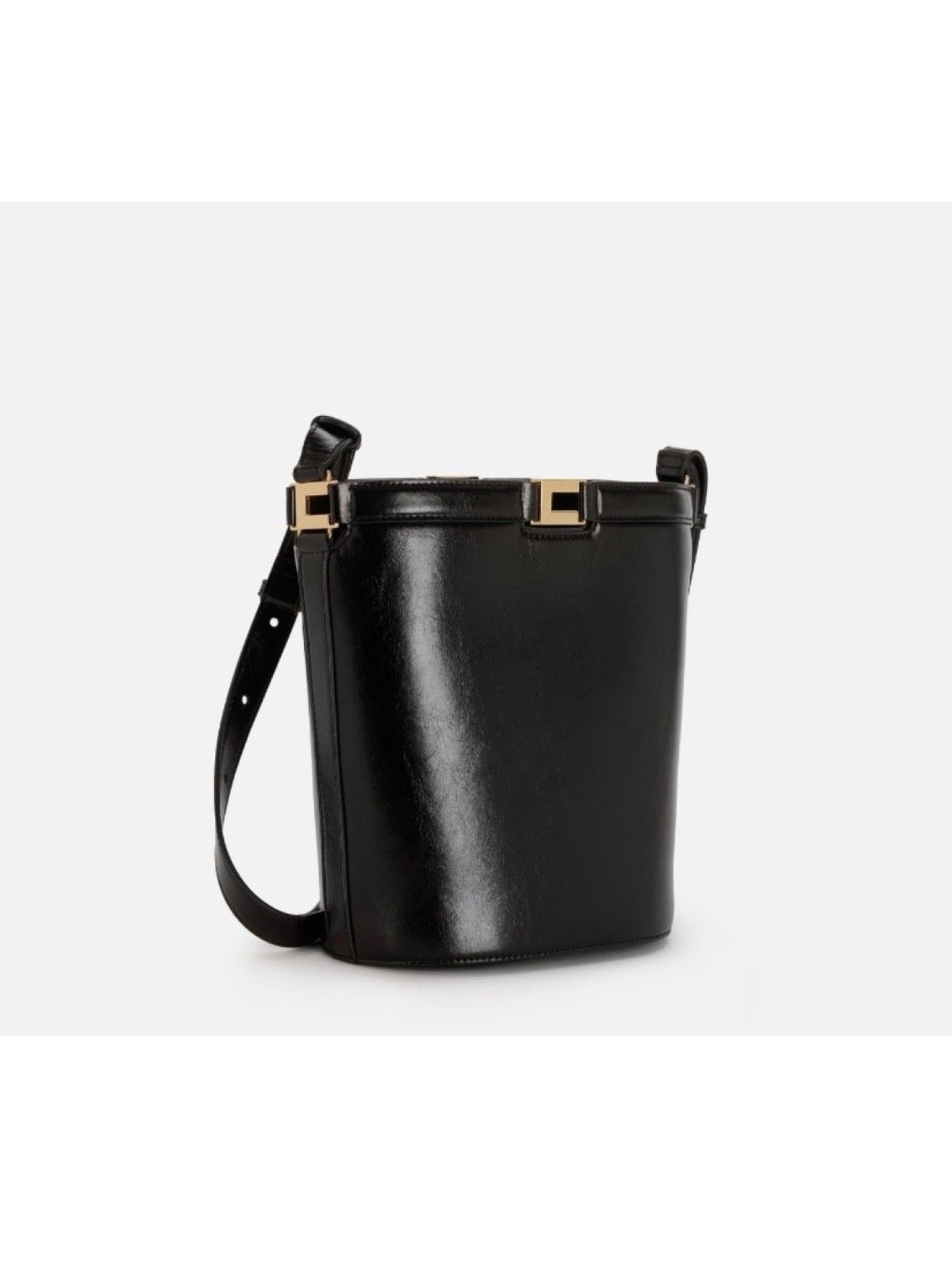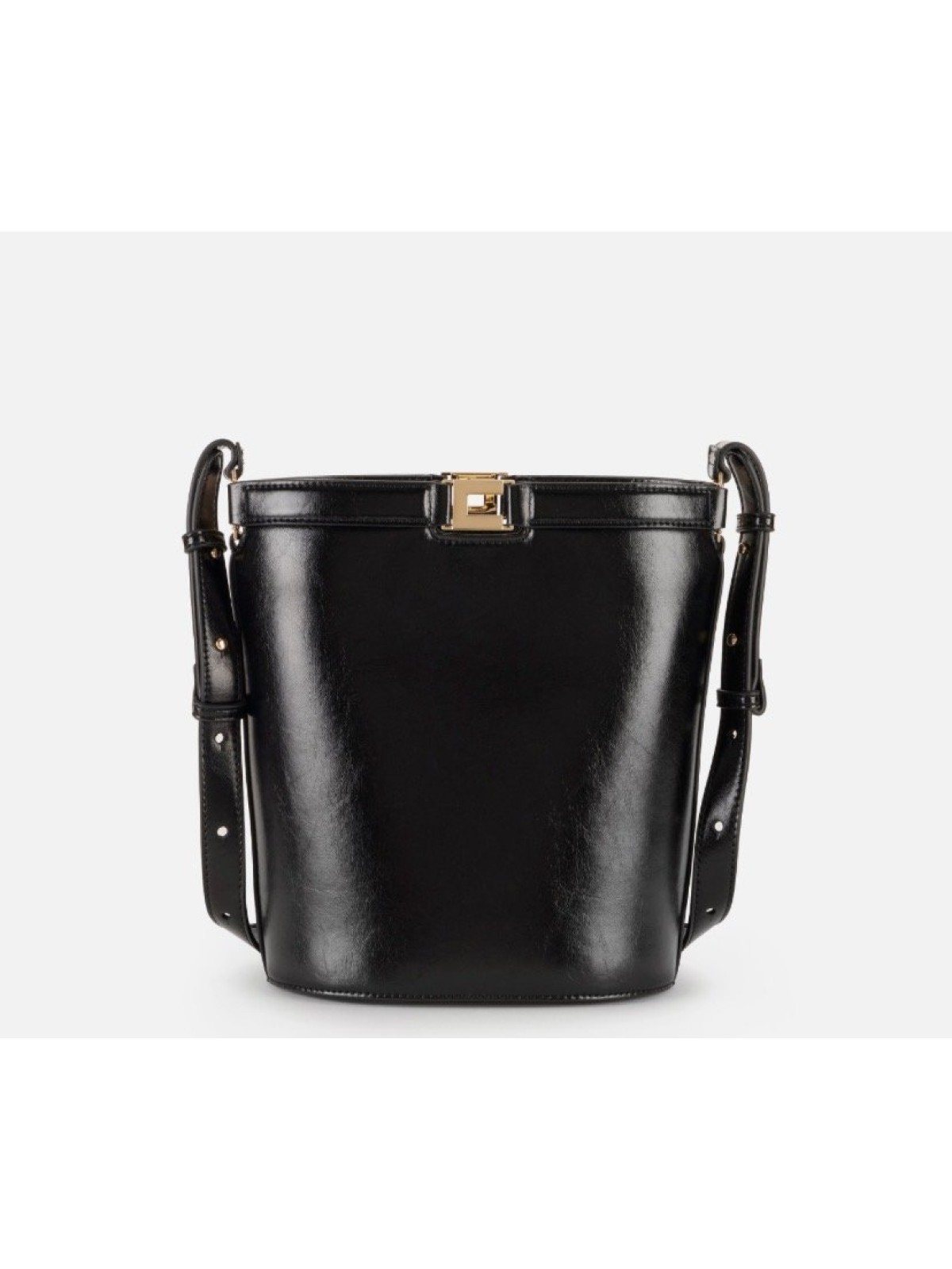 Borsa realizzata in materiale sintetico con texture effetto naplak. Con design a secchiello, ha tracolla regolabile ed è impreziosita dal dettaglio con logo in metallo dorato.