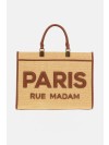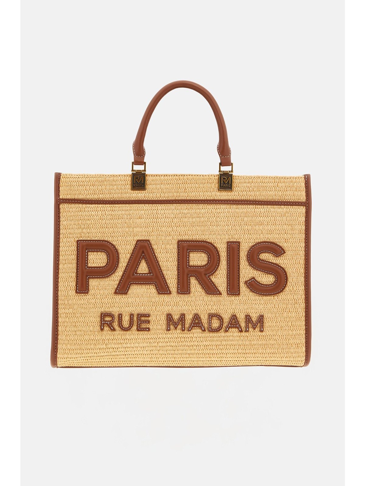 Tote bag in paglia con lati e dettagli in ecopelle, arricchita dal logo PARIS imbottito con cuciture a contrasto, manici in ecopelle con dettagli metallici logati in galvanica oro invecchiato, doppia tracolla, tasca centrale in ecopelle con zip e fodera interna in cotone con tasca. Dimensioni: L 35 cm × H 27 cm × P 15 cm.