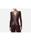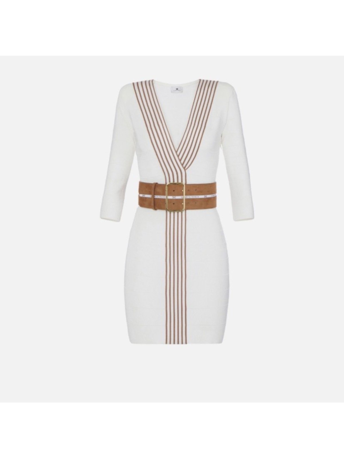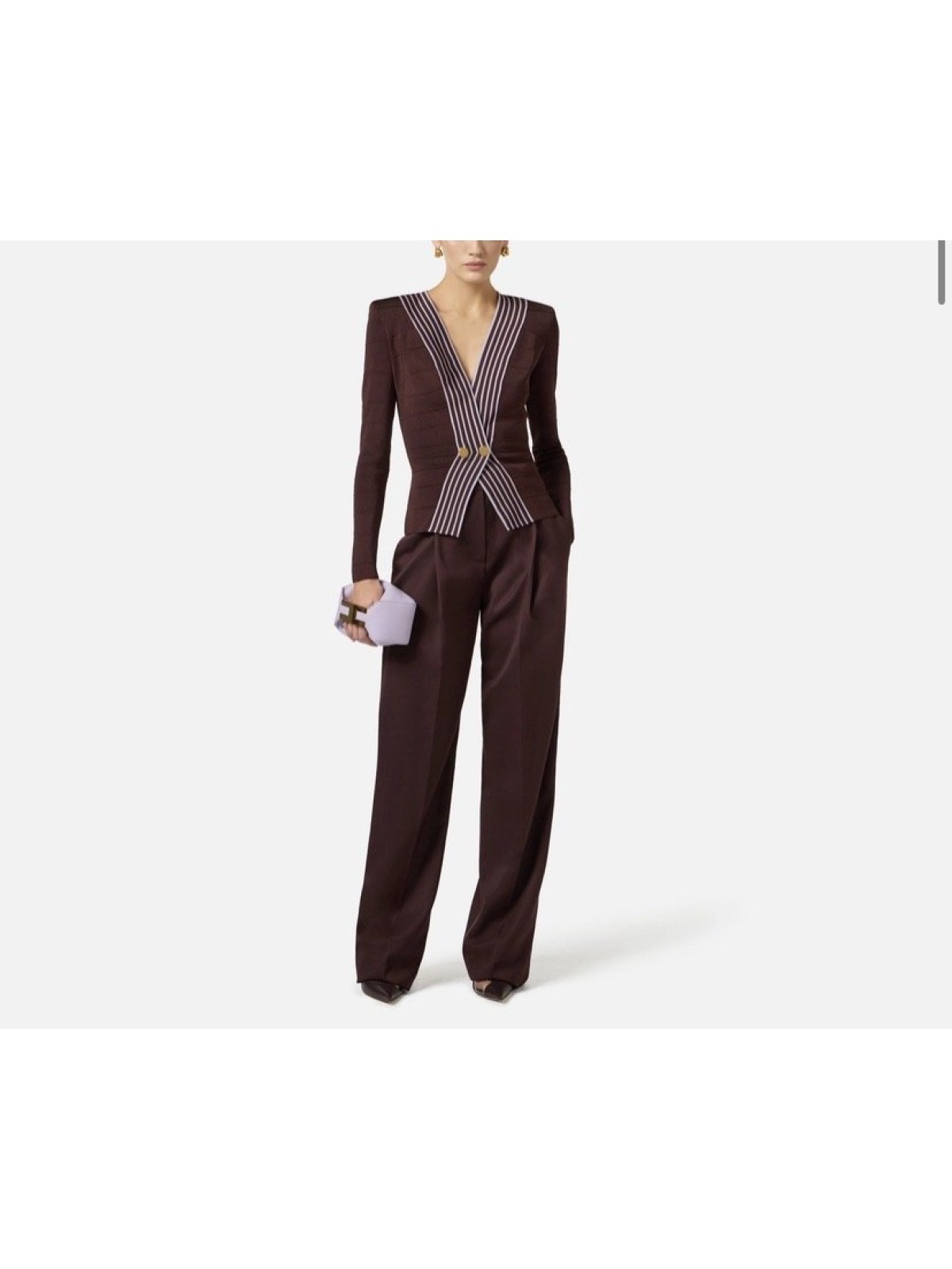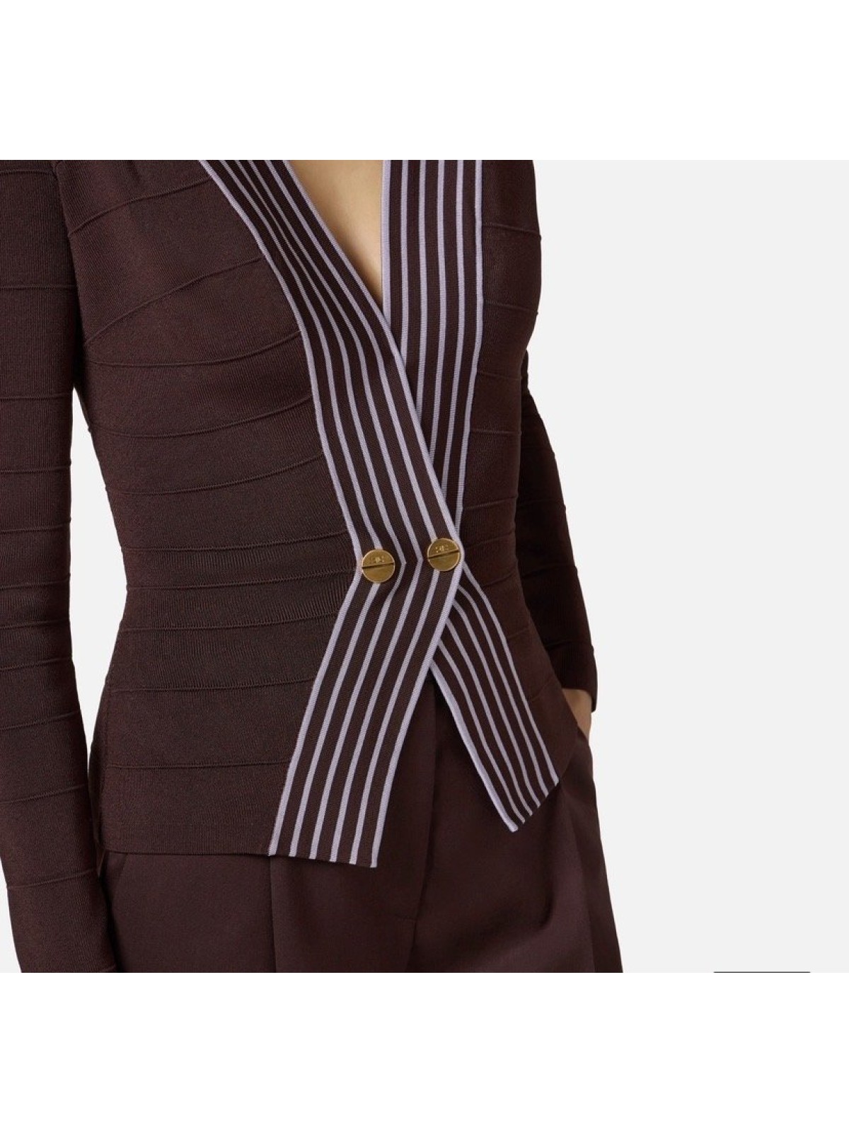 Cardigan in maglia con maniche lunghe e spalle strutturate per una silhouette geometrica. Si distingue per le bande decorative che incorniciano il busto con righe a contrasto. La lavorazione a costine e le nervature orizzontali rendono la trama vibrante. Bottoni in metallo dorato per delle note luminose. Vestibilità aderente.