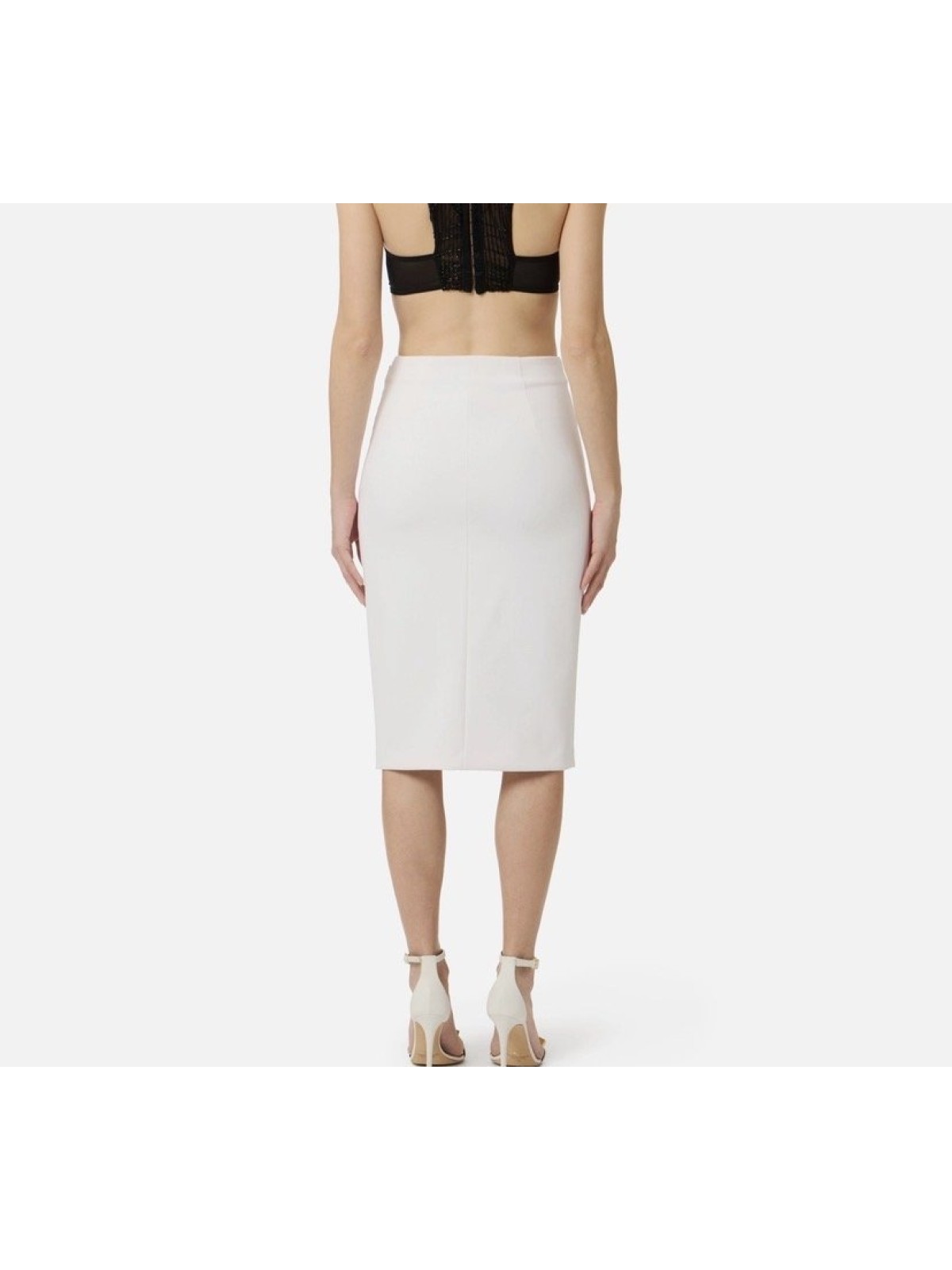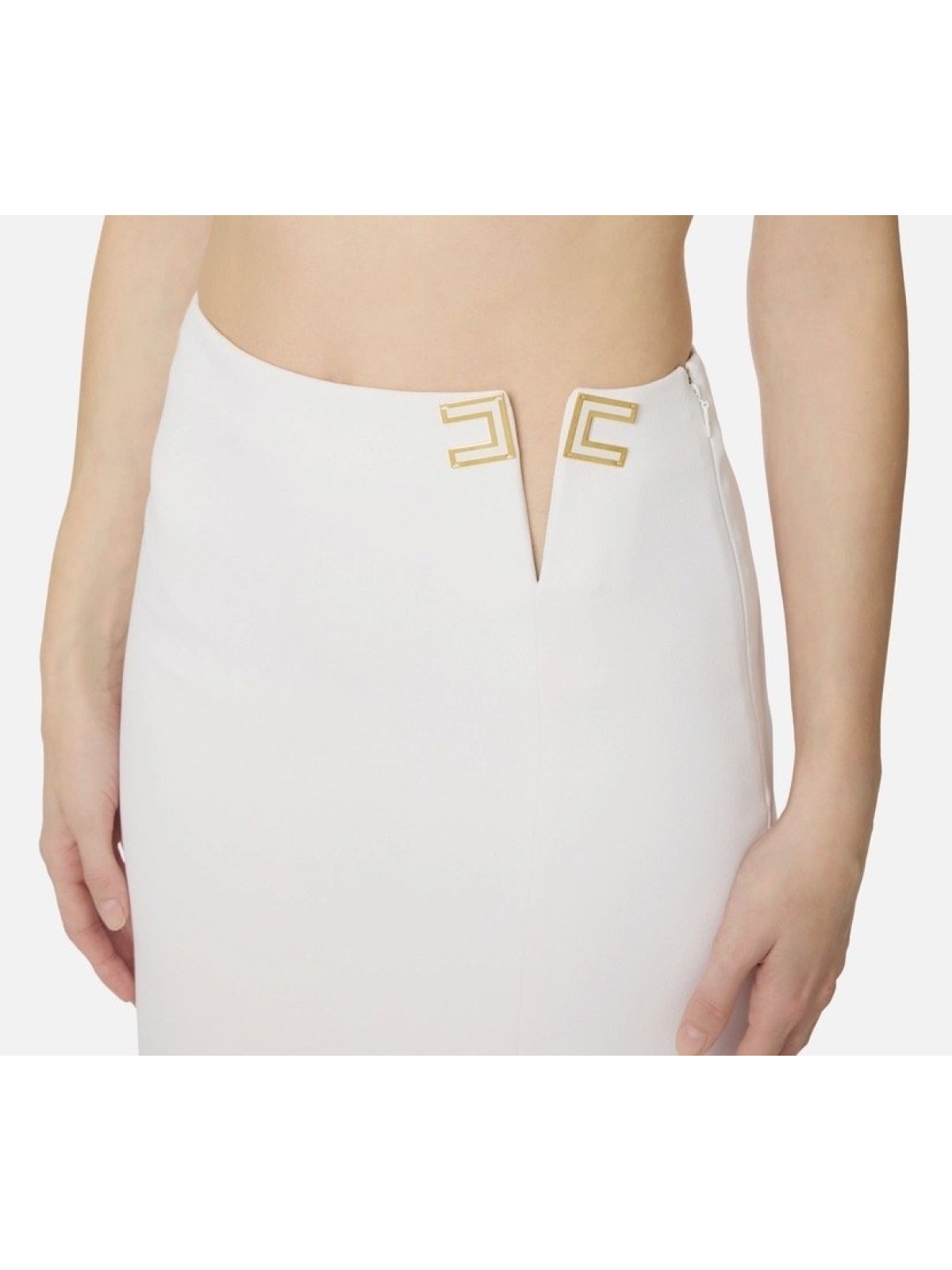 Gonna midi in doppio crêpe stretch. La vita è caratterizzata dall'apertura a V su un fianco, che si apre in uno spacco laterale. Impreziosita da dettagli con logo, in metallo dorato e smaltati internamente. Vestibilità regular.