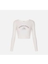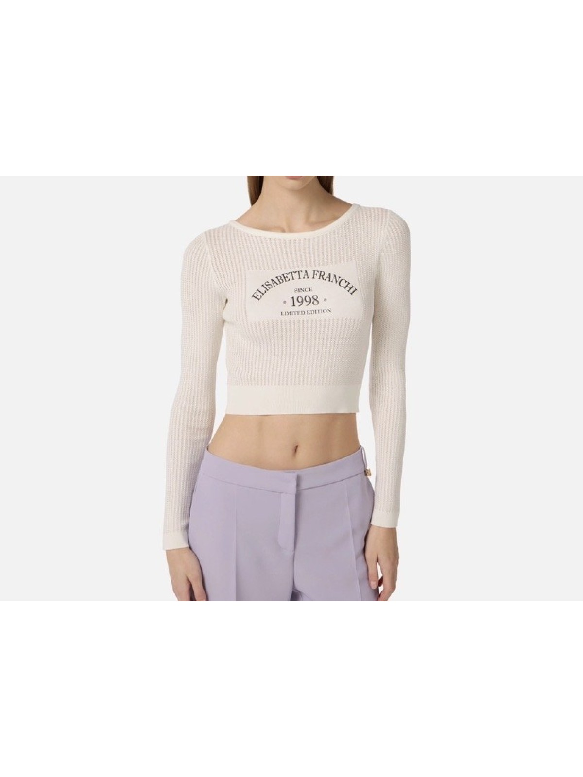 Top in maglia con scollo ampio e maniche lunghe. Si distingue per la trama lavorata a costine e ritmata da traforature. Focus sulla stampa con logo su tessuto rasato, che decora il davanti e aggiunge un dettaglio grafico. Vestibilità aderente.