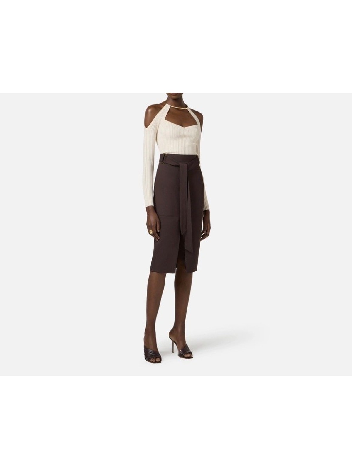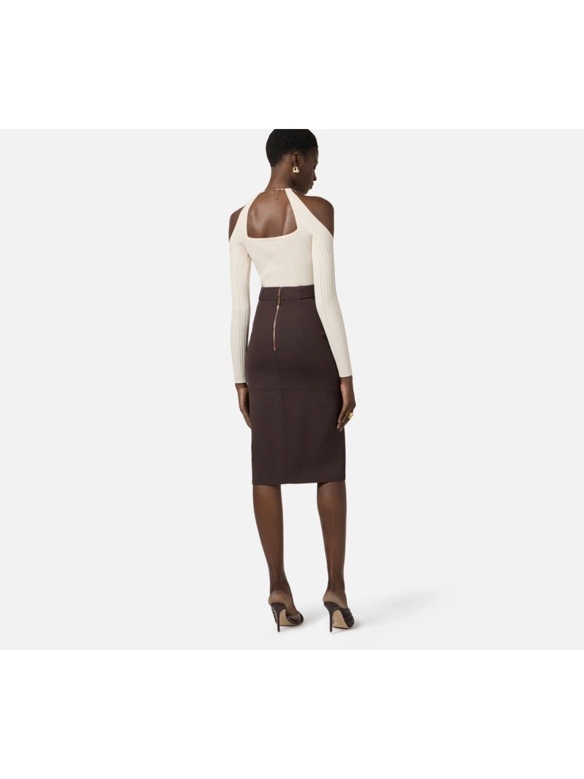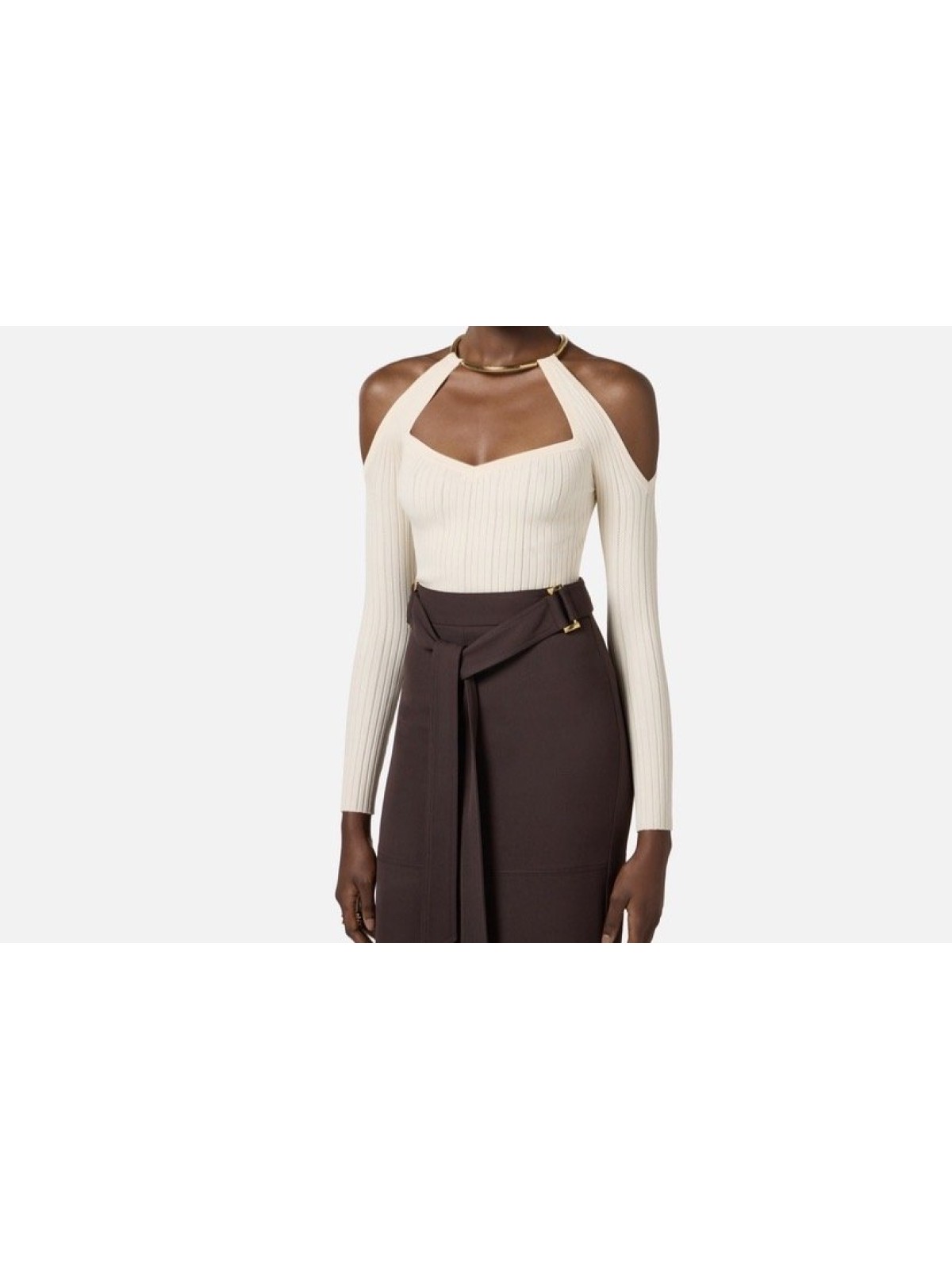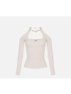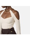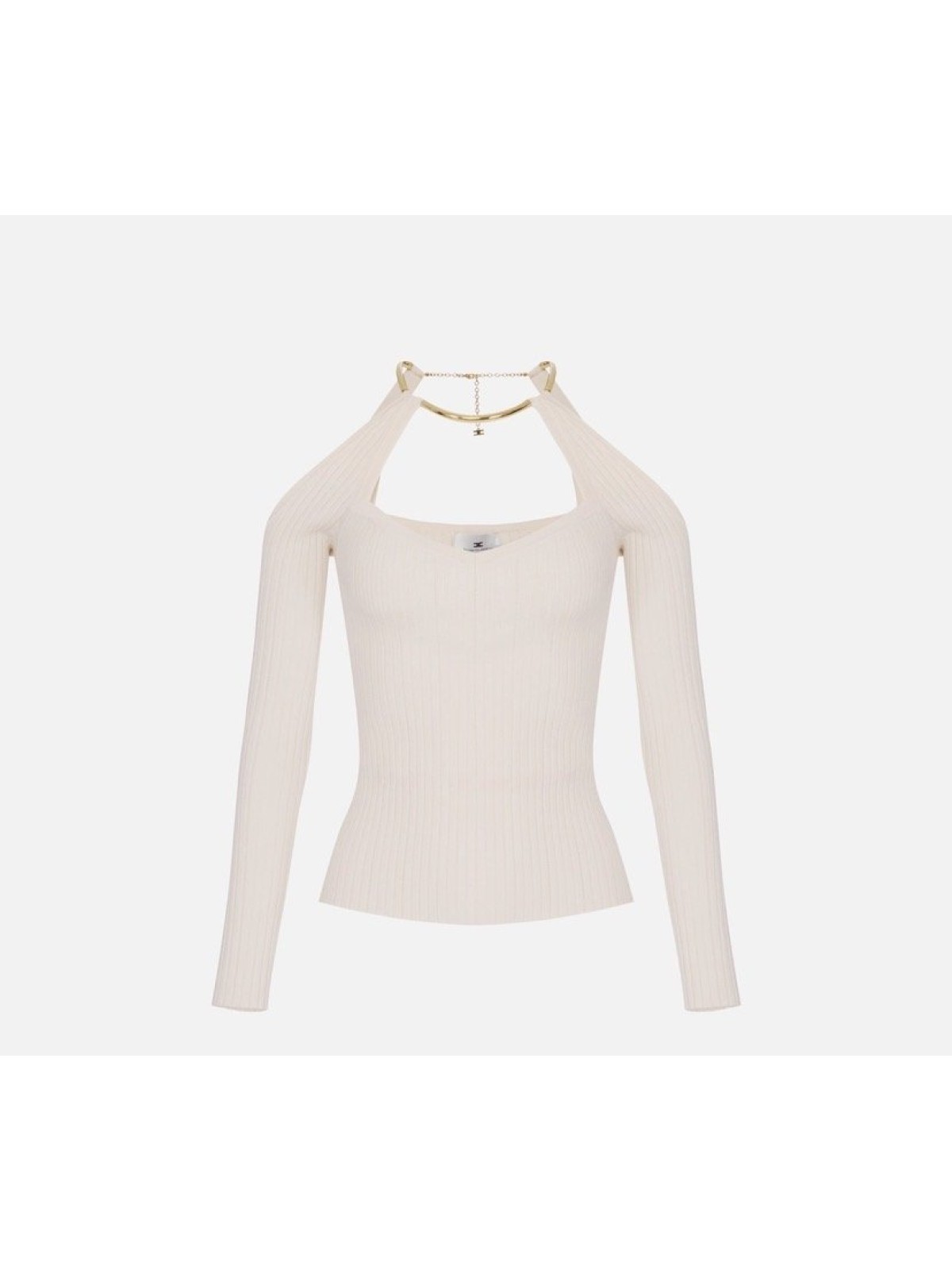 Top in maglia con spalle scoperte e maniche lunghe trattenute dal dettaglio gioiello in metallo dorato che illumina il collo. La lavorazione a costine traforate aggiunge carattere alla trama. Vestibilità aderente.