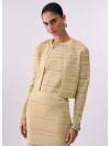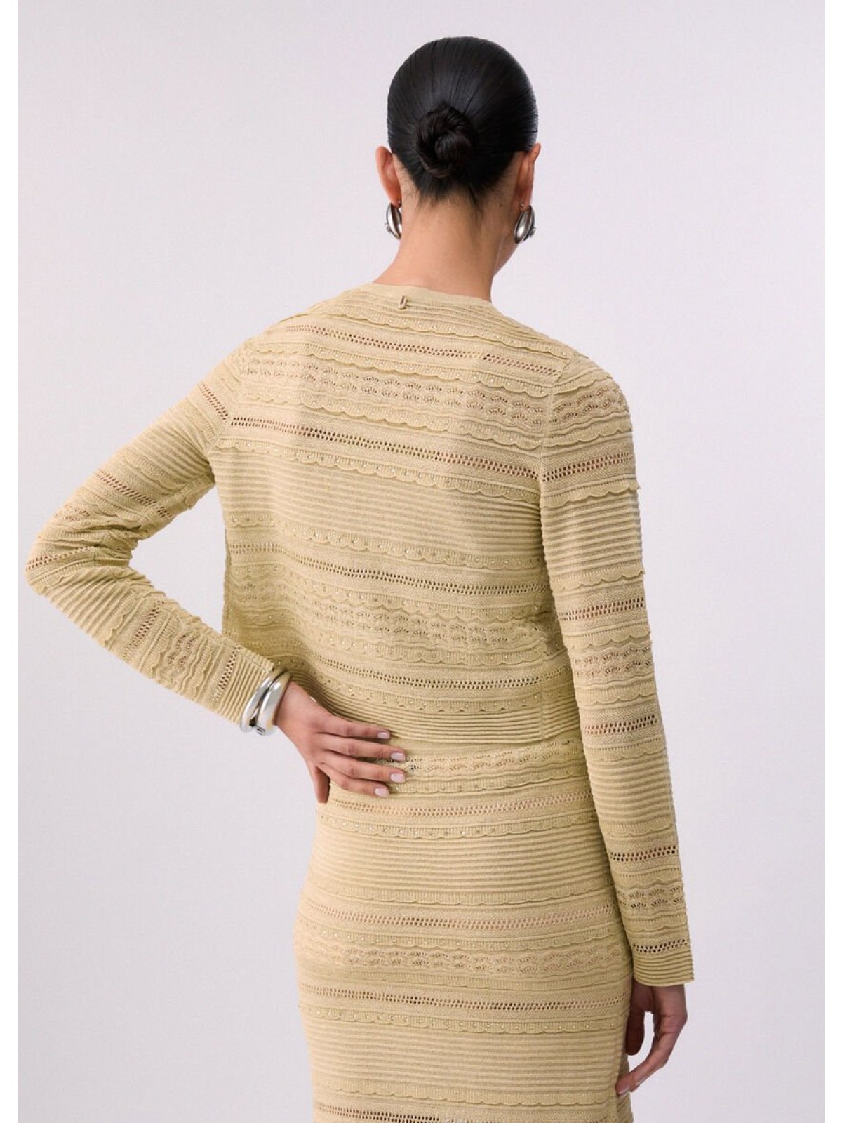 Questo cardigan gioca con una texture traforata, con interventi in lurex che aggiungono un delicato effetto glow. Indossalo come layer sui tuoi abiti eleganti e abbinalo alle mini borse della collezione.
