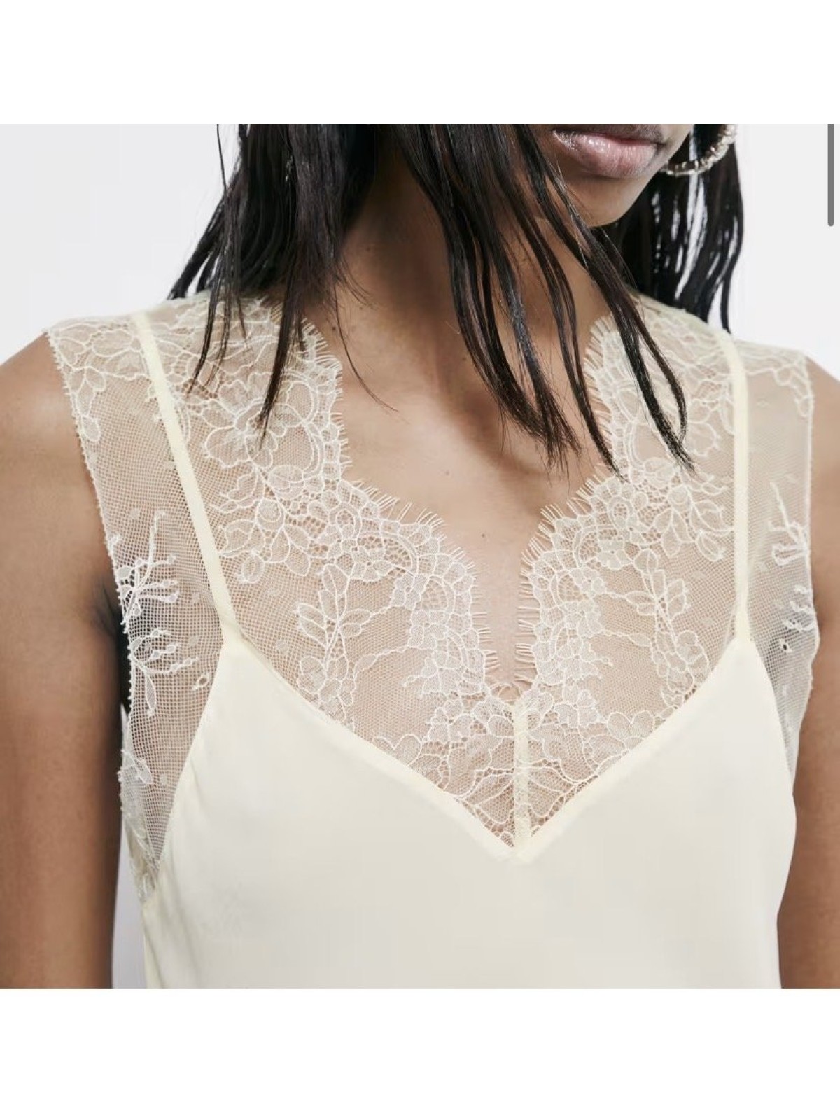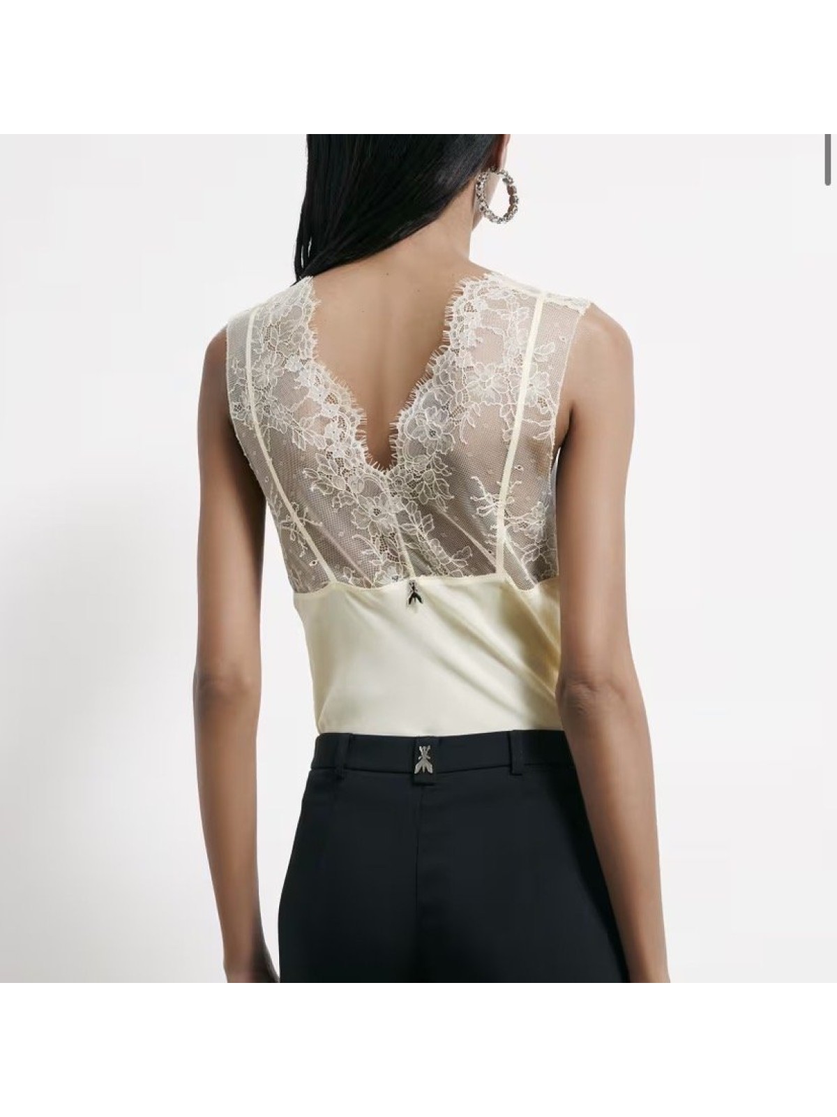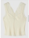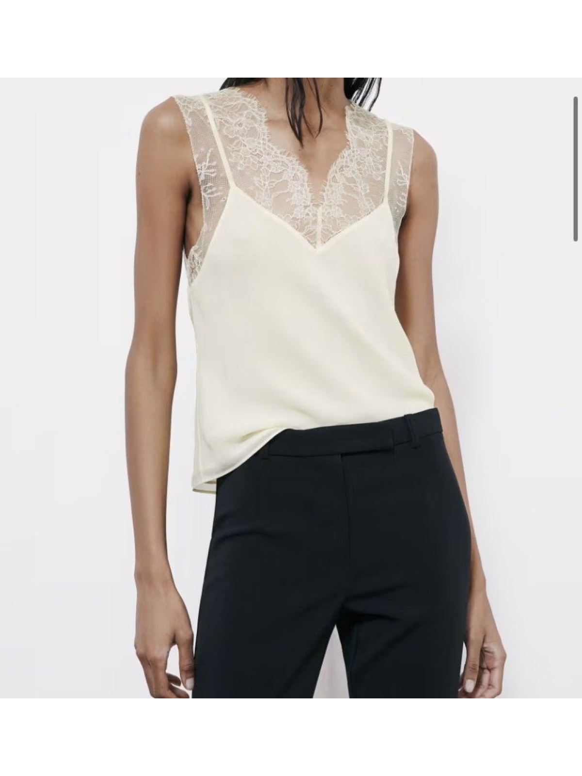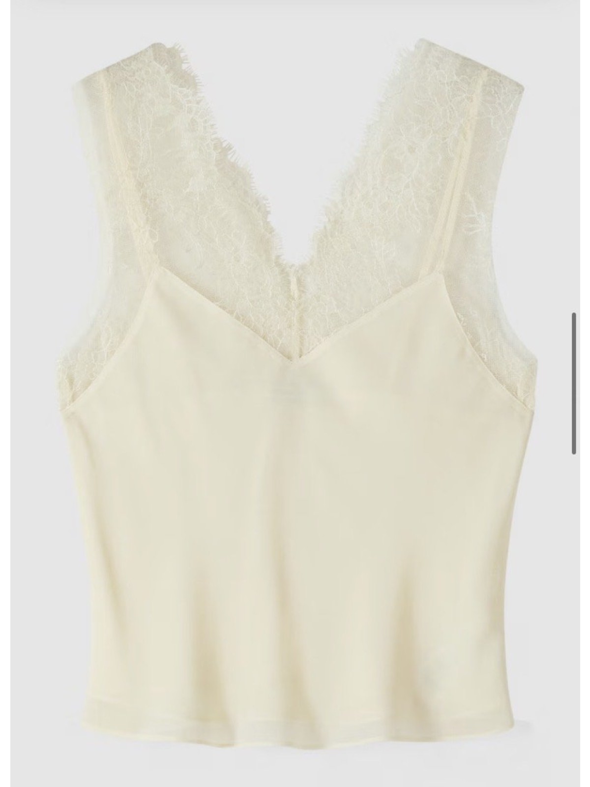 La capsule Party Time presenta un top con ricami in pizzo che decorano scollo e spallini, per un dettaglio sensuale d'ispirazione lingerie. Un essenziale nel guardaroba che completa con versatilità look da sera, sotto completi, ma si presta anche a interpretazioni daily glam con i tuoi denim preferiti.