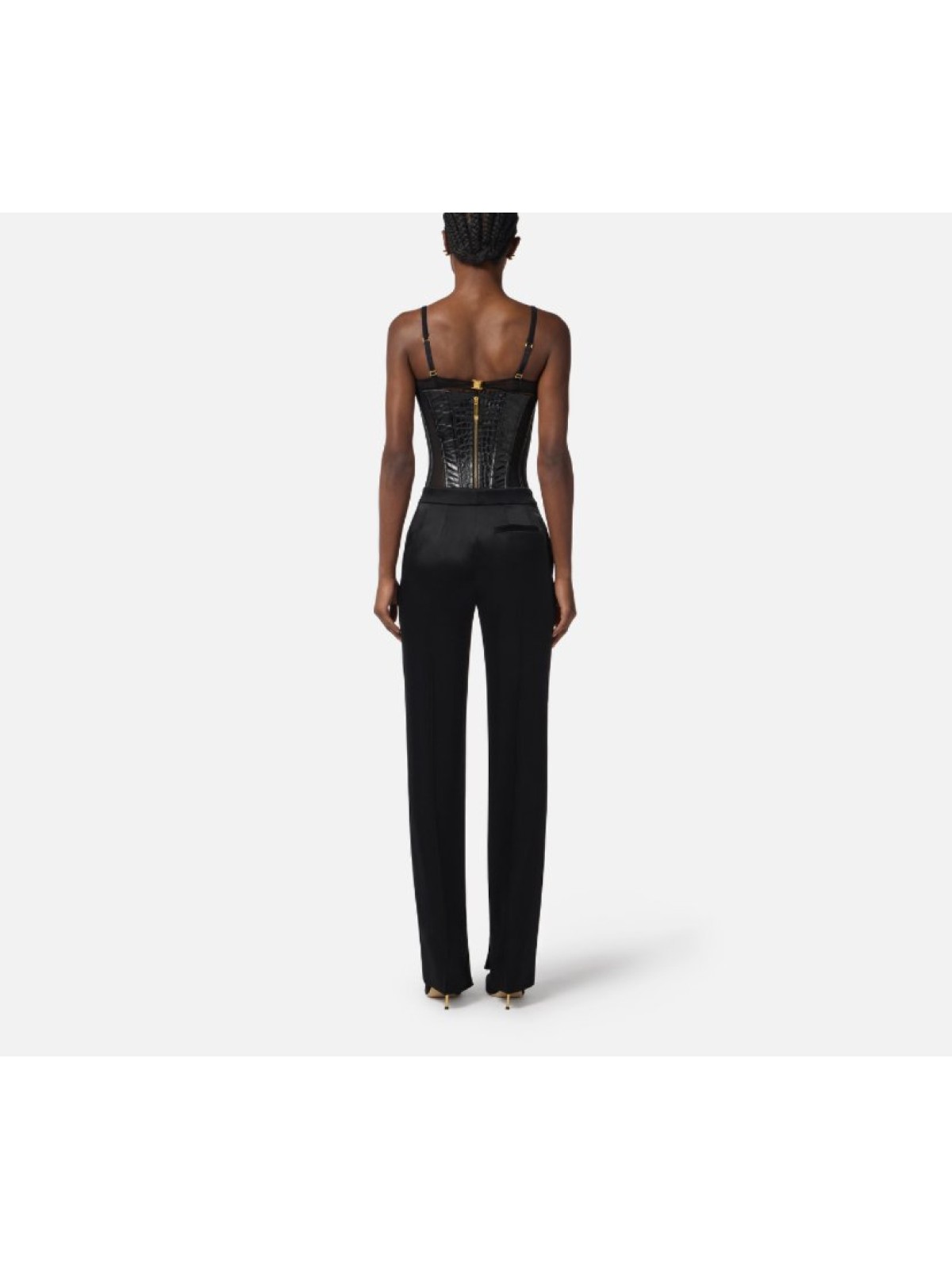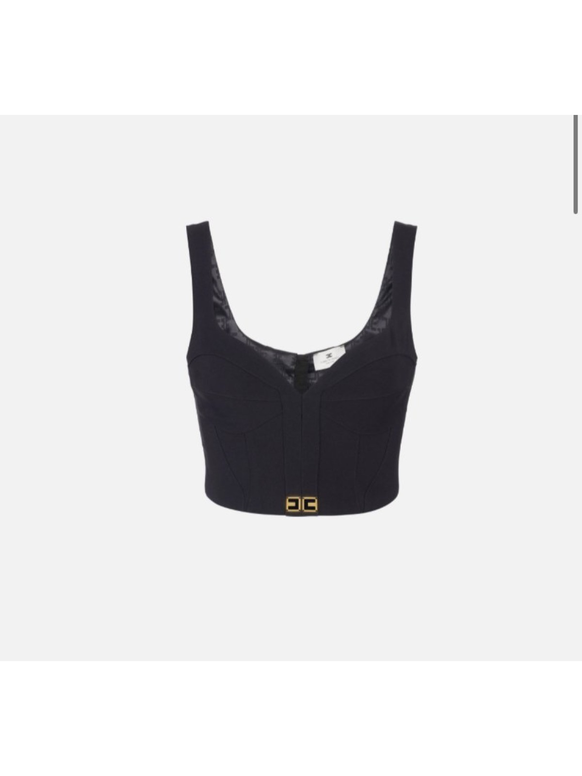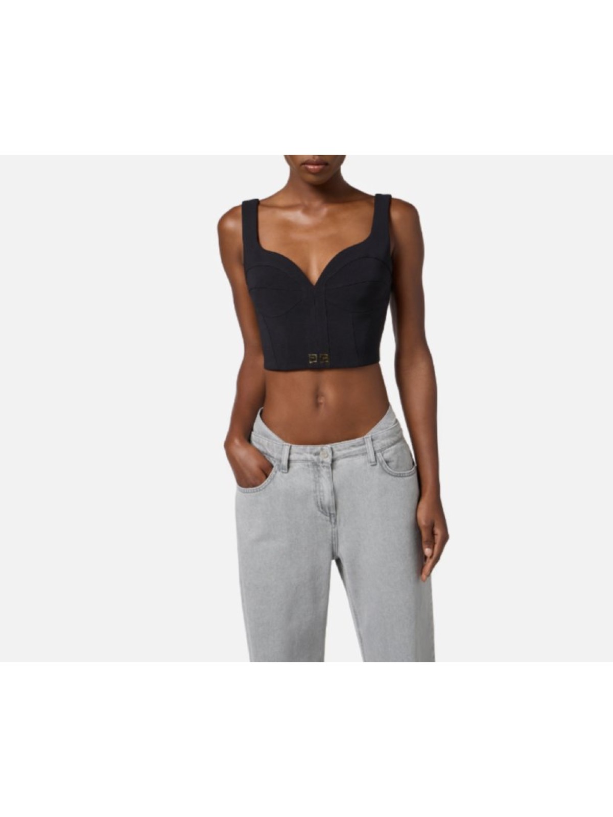 Top in crêpe leggero dalla vestibilità aderente. Con scollo a cuore, è definito dai tagli di ispirazione bustier che donano struttura a coppe e fianchi. Un doppio dettaglio con logo aggiunge una nota luminosa.